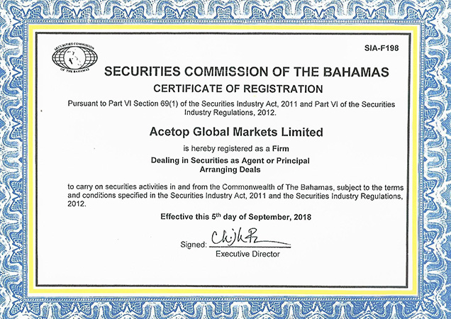 Acetop Global Markets Limited (领峰环球有限公司)持有巴哈马证券监察委员会SCB牌照。巴哈马证券监察委员会SCB是巴哈马国家重要金融监管机构,拥有严苛的制度,具安全、快速、专业等诸多优势,确保市场在公平、健康、有序的环境下运行。SCB监管牌照获英国、美国权威机构之认可,其灵活便捷的投资制度,得到全球金融投资者的追捧。领峰环球全球法人机构识别编码LEI:213800E93LQYFDVF8Q77。