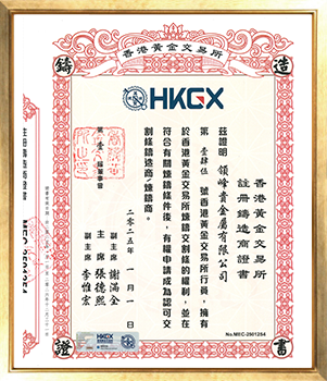 领峰贵金属有限公司是香港黄金交易所认可的电子交易行员(行员编号145号),持有AA类别市场交易有效营业牌照,可经营99金、港元公斤条、伦敦金/银及人民币公斤条业务。